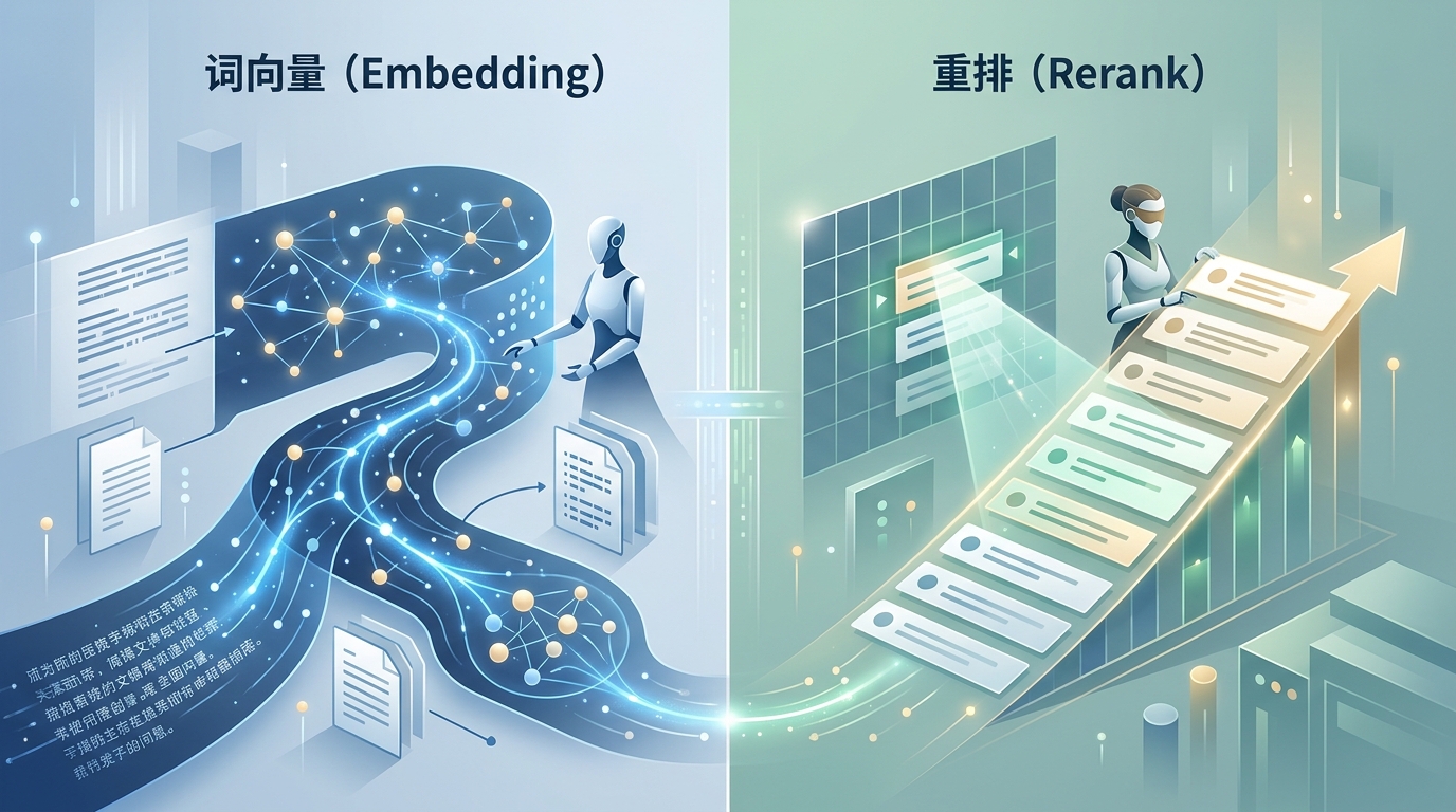 Embedding 和 Rerank 经常被放在一个采购清单里,但它们并不是谁替代谁的关系。真正要搞清楚的是:你当前的瓶颈在于召回覆盖不足,还是候选排序不准。